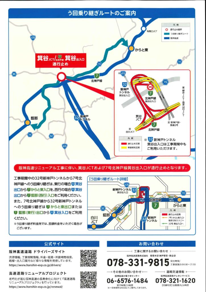 12/1(月)までの以下の期間におきまして、最寄り高速出入口になります箕谷出入口が通行止めになります。ご来場予定のお客様で該当高速道路を利用する方はご注意ください。