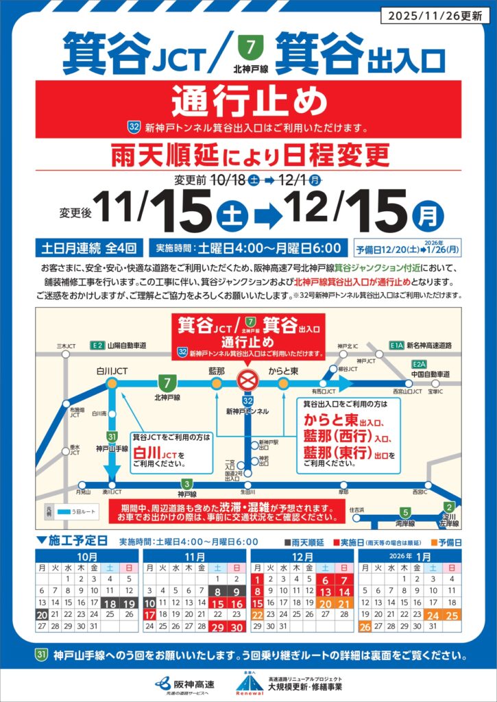 最寄り高速出入口になります箕谷出入口の通行止め日程が変更になっております。ご来場予定のお客様で該当高速道路を利用する方はご注意ください。